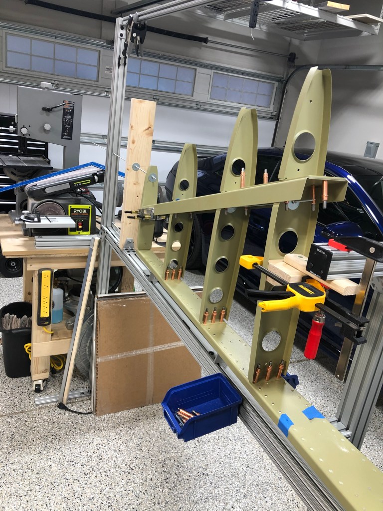 Using the horizontal stab jig to set the vertical stab. In the picture you can see the ‘custom’ bins I made to hold tools and clecos. The bin is able to slide in the tracks to where it is most useful…or other times, out of the way. Rare picture of the Blue car not under the cover during the build…must have been a temporary oversight! ha!