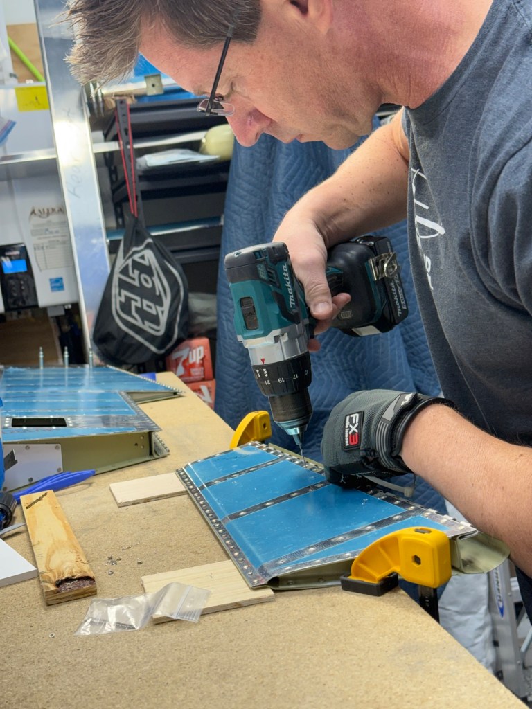 Back in the workshop! Once again, it seems like ages ago that I was last working on the Rocket. Hope to be able to get at least a little work done every week. Here I am getting setup to install the piano hinge on the trim tab portion. This includes match drilling the hinge as well as the additional strips of aluminum that provide extra strength/support to this section of the trim tab. (Another shout out to those cleo clamps! Keep finding uses for them and seem to always need one more!)