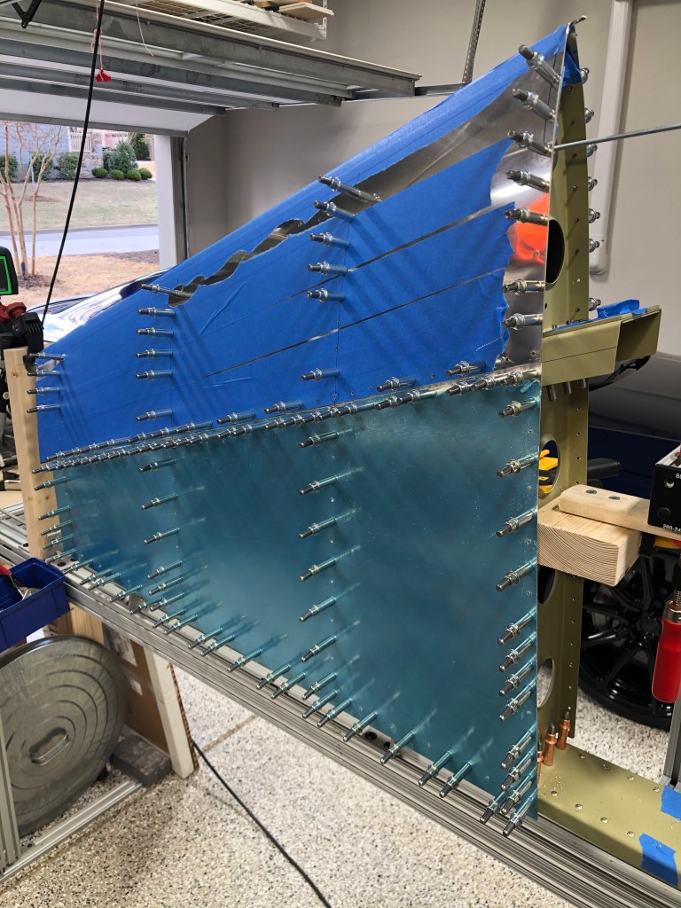 Another of the fancy, selfie pictures to make sure Mr FAA is sure that I actually built this airplane. You can see all kinds of clamping devices, holding the skin in place as I drill and cleco, drill and cleco. Getting so close to taking down the horizontal stab jig which I am looking forward to. That means I will be building the much larger wings jigs which I am NOT looking forward to since space is becoming an issue in the hanger (garage). I believe the paint booth needs to be rethought and rebuilt to make more room to build