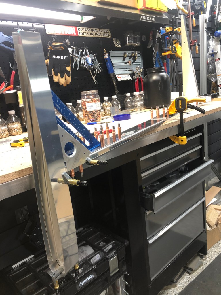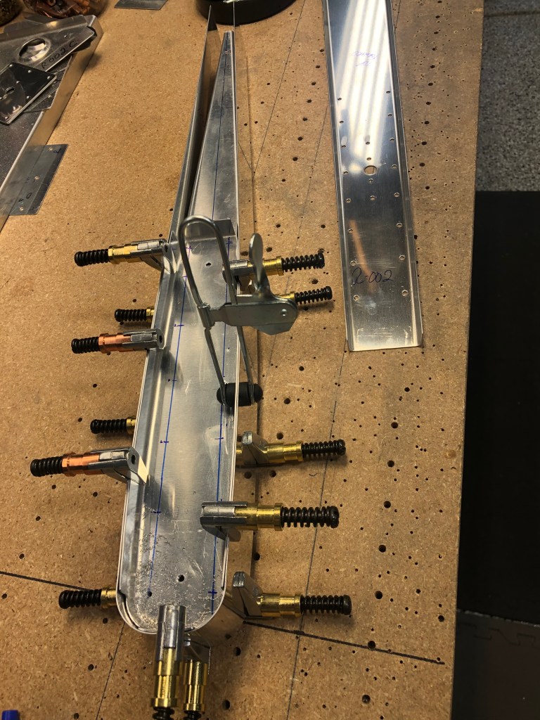 Thankfully, it has only been a few days since I was last in the shop. Today I continued to fit the rudder skeleton together with some drilling and cleko installation. Starting to ‘see’ the rudder now.